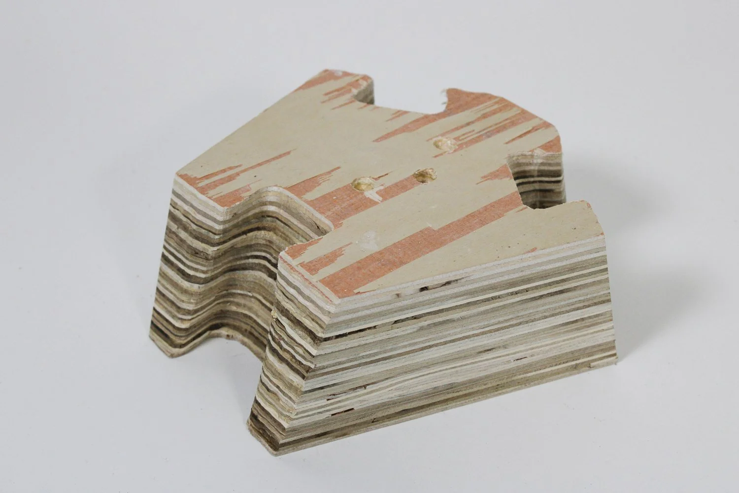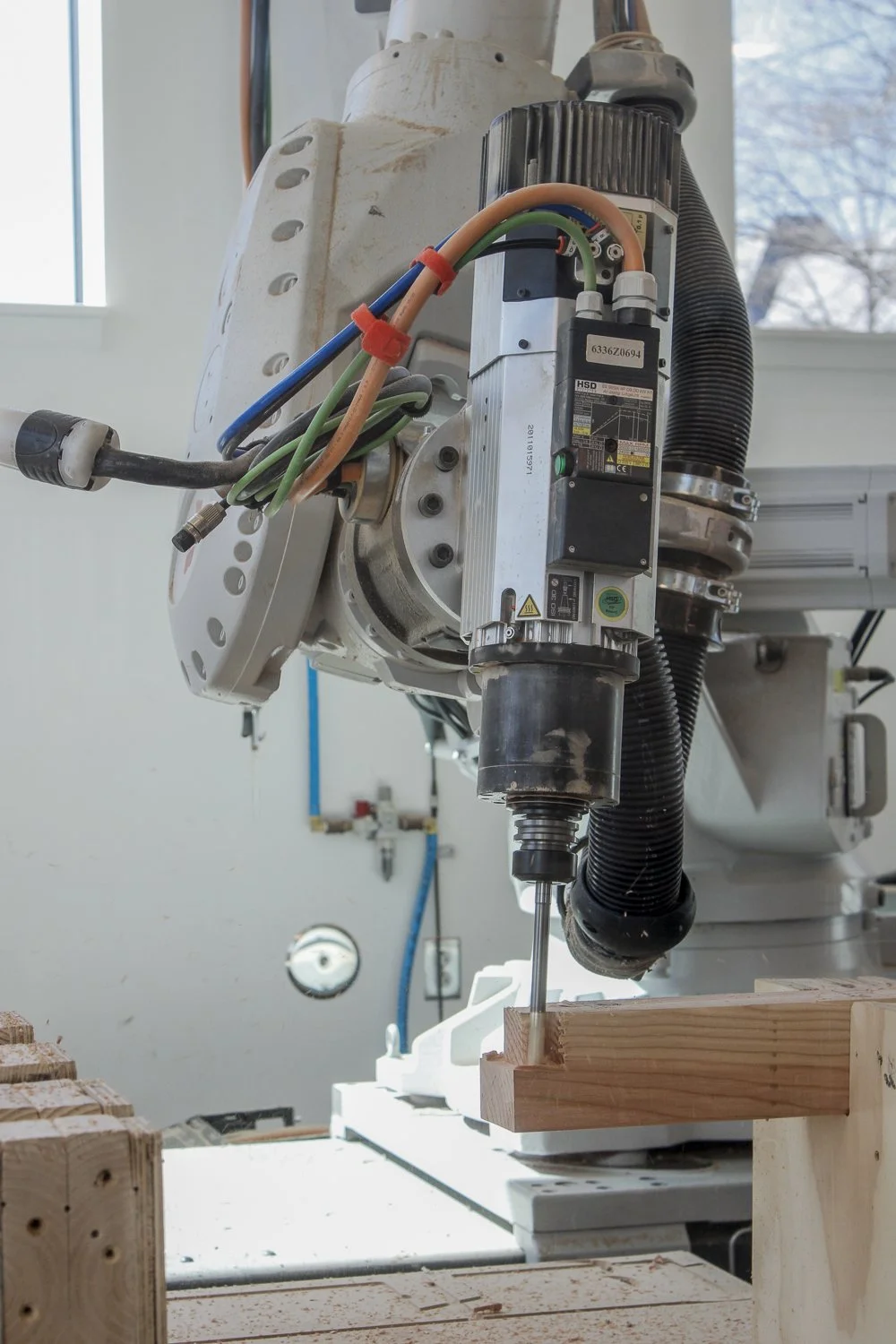 The assembly of node elements involved a process of stock gluing and shaping, followed by robotic milling with a 6-Axis IRB 6700 robot. The pieces were glued from 3/4” plywood, which were shaped into hexagonal stocks for the robot to mill.
