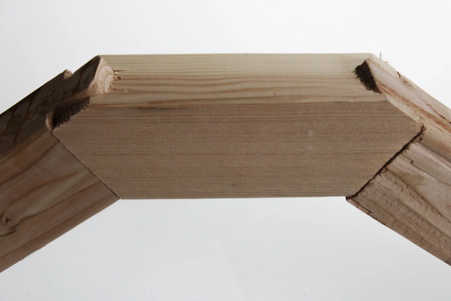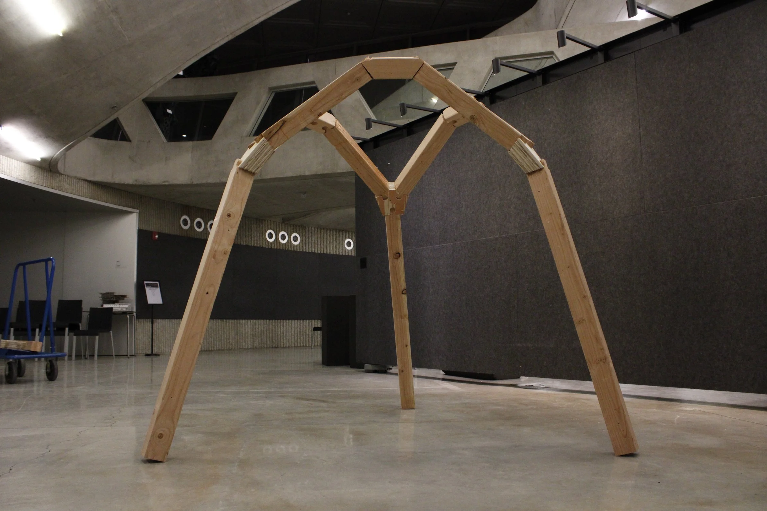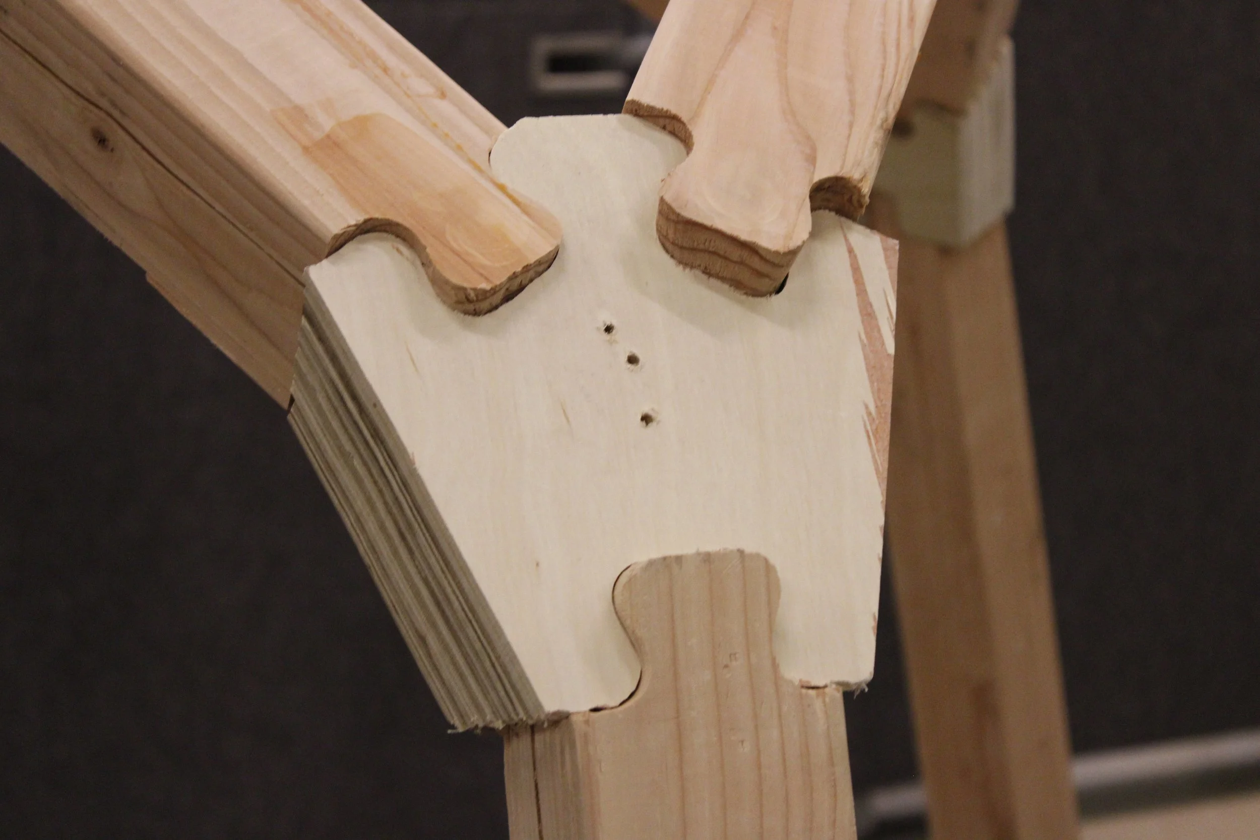 In order to test the capabilities of this wood to wood connection system, a full scale model was assembled using glued plywood nodes and 4x4” timber posts (3.5 x 3.5”).