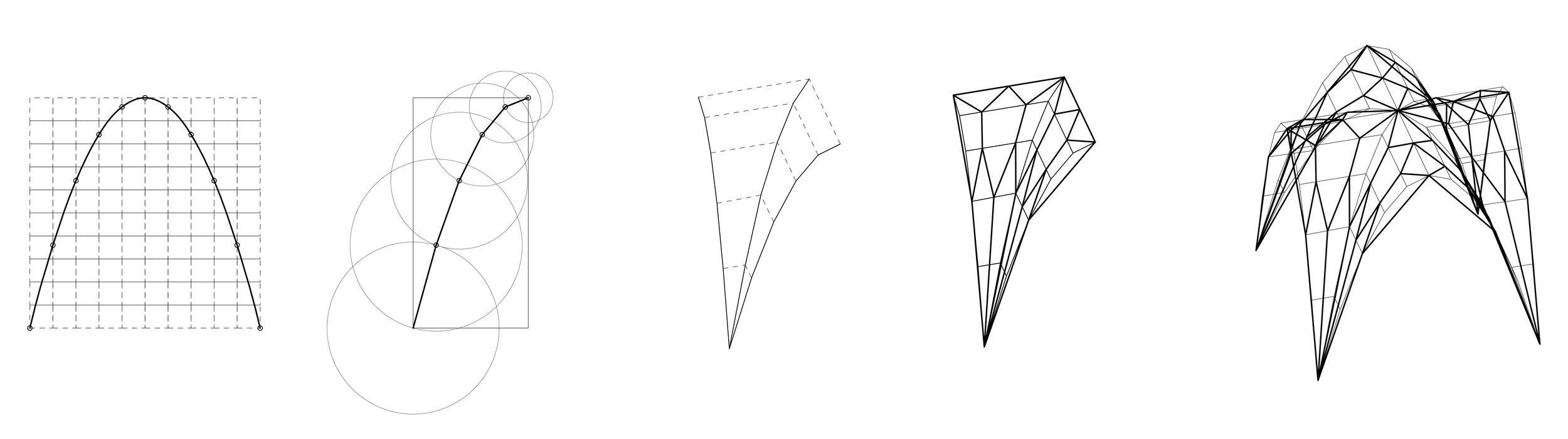 Above, a catenary curve is split in half, divided into five sections, and rotated 90 degrees around a base point. This method allows the conversion of funicular 2d geometry into a quarter-vault. Subdivision, as well as curve shape can be adjusted as needed.